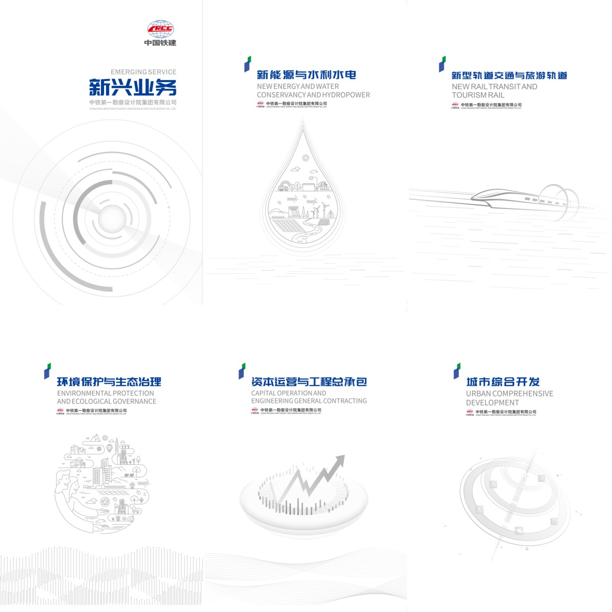 鐵一院作為新中國成立的第一批鐵路勘測設計單位,如今已發(fā)展成熟,涉足各領域,近年在新興業(yè)務版塊發(fā)展成就更是數(shù)不勝數(shù),其中包括“新型軌道交通與旅游軌道”、“新能源與水利水電”、“環(huán)境保護與生態(tài)治理”、“資本運營與工程總承包”、“城市綜合開發(fā)”等,在總冊與各分冊的封面設計上,Goappe遵循系列設計手法,采用國企簡約高端設計風格,以總冊的“業(yè)務聚焦性”及分冊的“專業(yè)指向性”作為創(chuàng)意點,最終形成系列畫冊封面,詮釋各專業(yè)內(nèi)容。