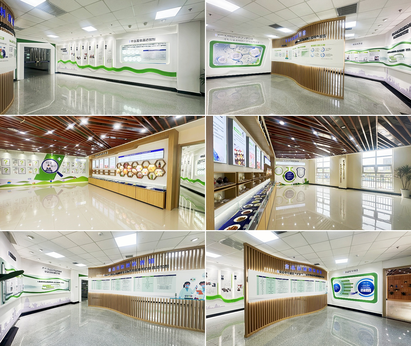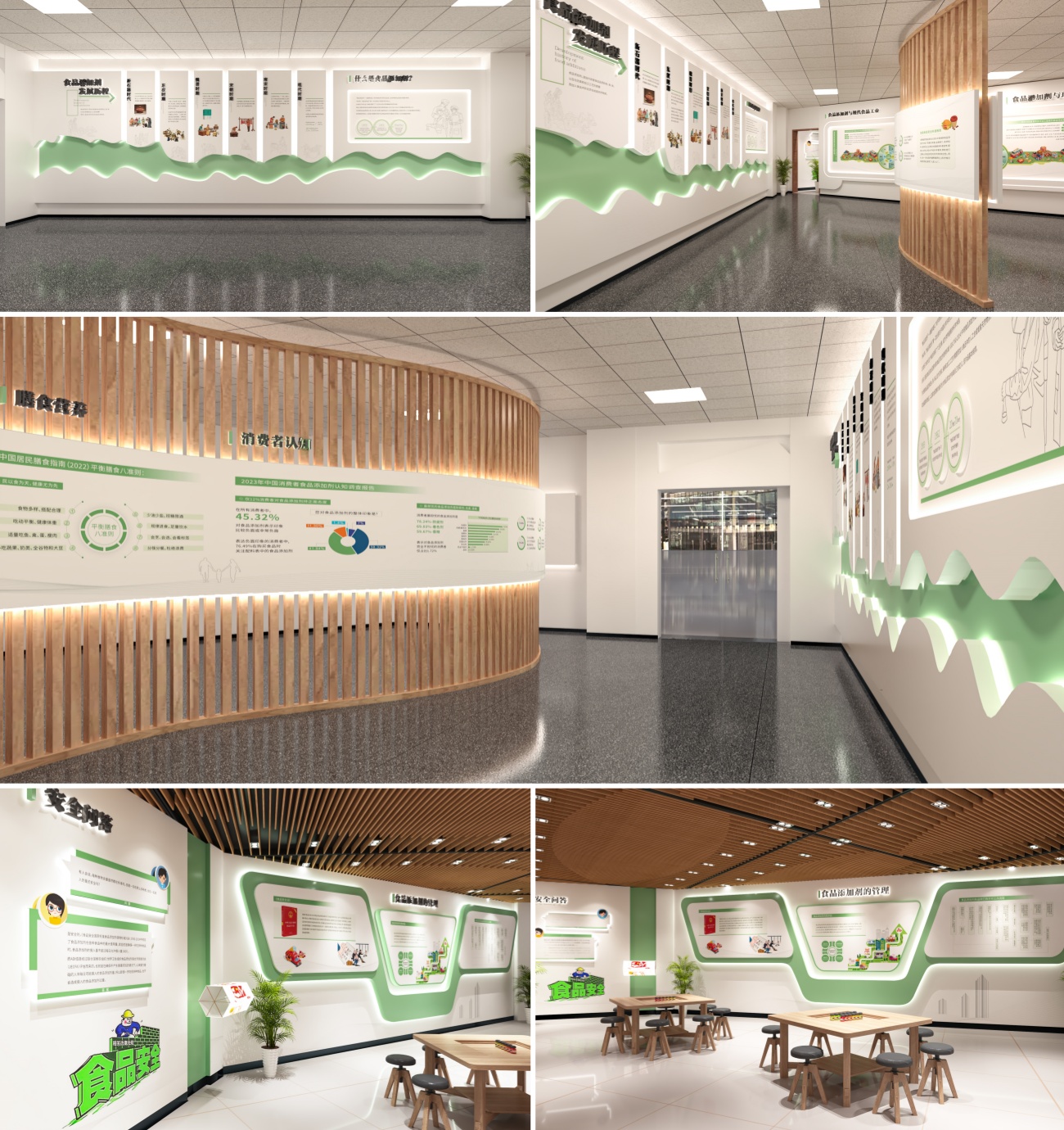 提取關鍵詞“安全”和“健康”,如果用色彩語言表達,不言而喻“綠色”作為主色調(diào)是最為貼切的,且能在設計表現(xiàn)上給予參觀者耳目一新的視覺感知,但展廳空間僅使用單純的綠色顯然是不夠的,經(jīng)典的“白色”及具有市場監(jiān)管屬性的“藍色”,即可在一定程度上緩解單色調(diào)造成的視覺沖擊,又可與展廳實質(zhì)功能建立聯(lián)系,且很大程度上起到美化整體空間的作用。