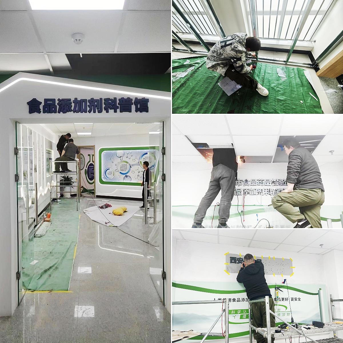 本項目的原始施工現(xiàn)場,不同于以往展館最初的毛坯狀態(tài),而是有了一定的基層建設,因此再度進場施工必須要注意原始基層的保護,施工過程需要慎之又慎,除此之外,項目空間改造環(huán)節(jié)中存在新建墻面,“輕鋼龍骨隔墻”作為展館改造中的常規(guī)手段,自然不可或缺。其次便是廣告畫面及施工工藝等細節(jié)上的考量,但作為有著豐富展廳展館打造經(jīng)驗的團隊伙伴,在超緊工期、超高驗收標準的要求下,順利完成施工作業(yè)一直基本要求。