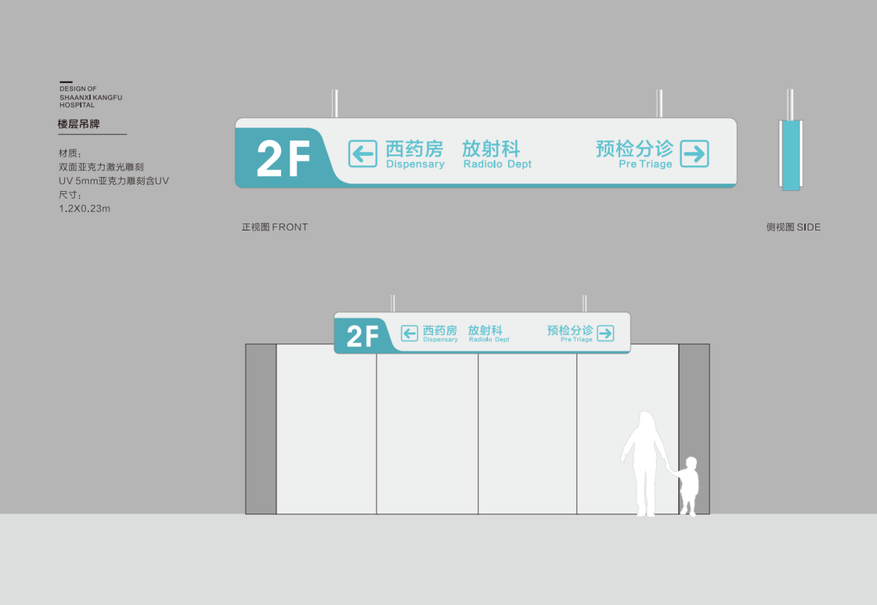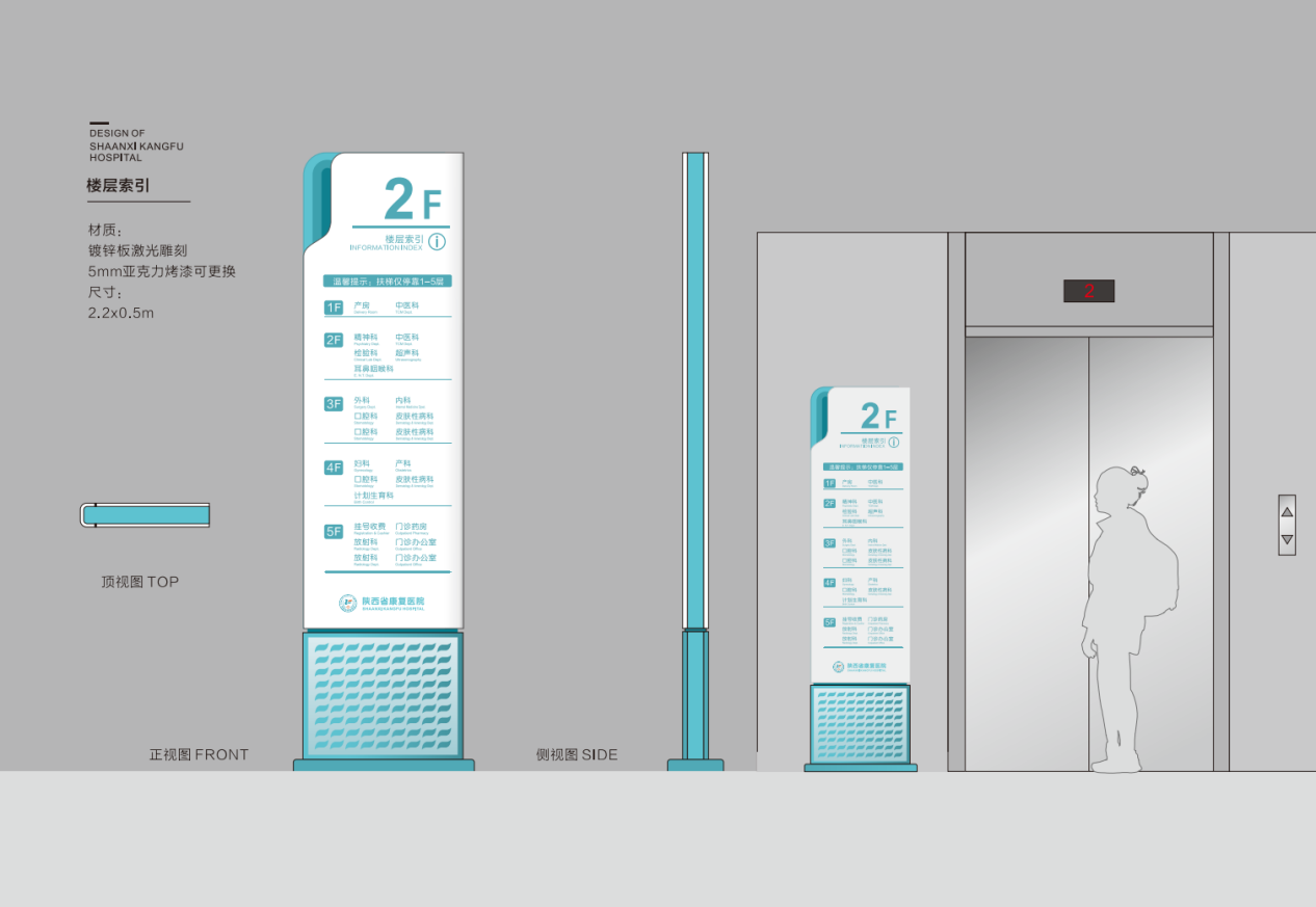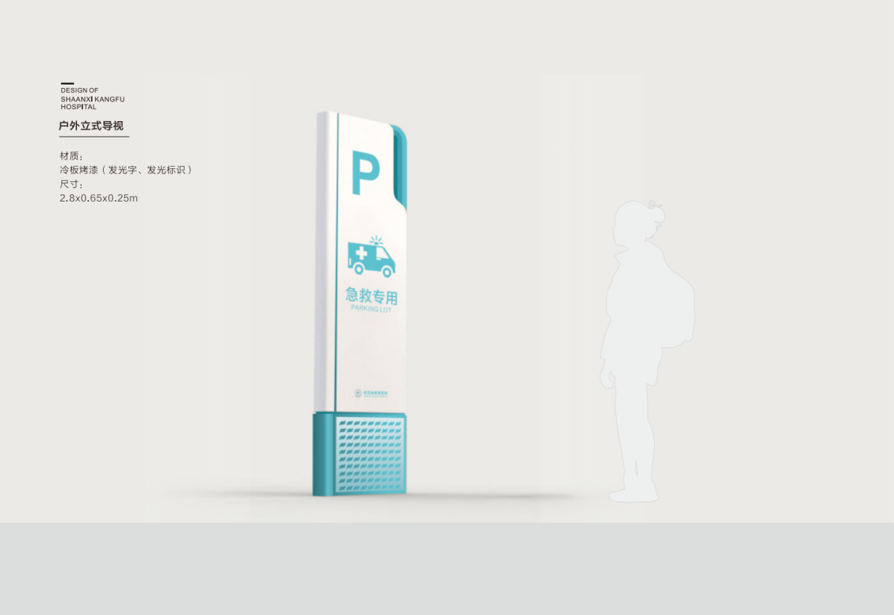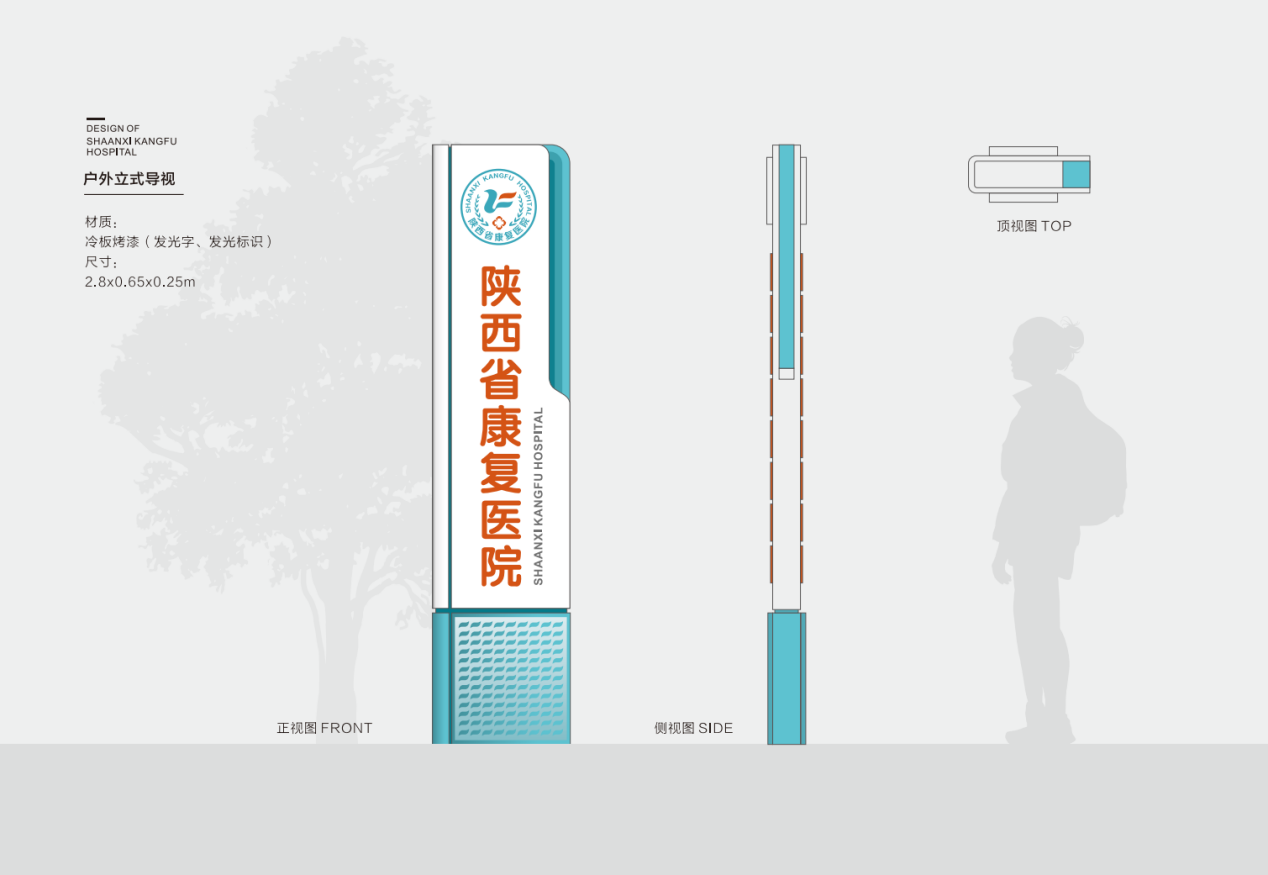 標(biāo)識導(dǎo)視系統(tǒng)設(shè)計,是傳統(tǒng)建筑與視覺傳達設(shè)計的中間學(xué)科,在功能表現(xiàn)上需有信號、標(biāo)志、說明、指示、預(yù)示等多種含義。為確保最終成品導(dǎo)視功能的合理性,項目組所有設(shè)計項的開展均嚴(yán)格依據(jù)相關(guān)法律依據(jù)及標(biāo)準(zhǔn)規(guī)范、人體工程學(xué)可視參數(shù)、標(biāo)識信息識別參數(shù)、視覺信息識別參數(shù)及陜西省康復(fù)醫(yī)院院區(qū)實際空間數(shù)據(jù)等,進行有效規(guī)劃,從而保證最終識別效果的規(guī)范性。