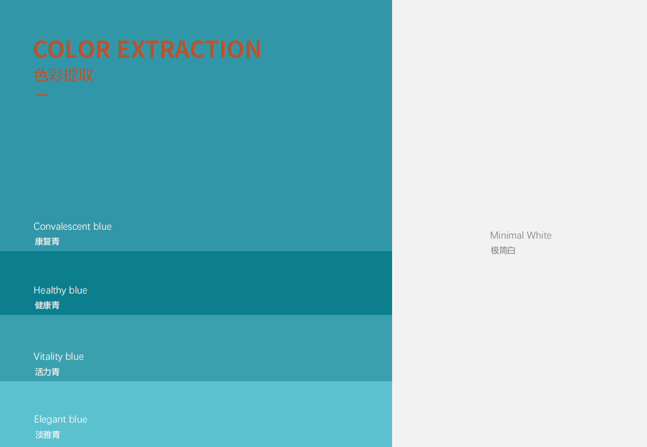 在設(shè)計(jì)元素的提取中,設(shè)計(jì)團(tuán)隊(duì)經(jīng)過(guò)綜合考慮即設(shè)計(jì)思維搭建,最終決定采用與康復(fù)醫(yī)院主體識(shí)別符號(hào)有著深度視覺關(guān)聯(lián)的“生機(jī)葉片輪廓”和具有滋養(yǎng)孕育萬(wàn)物的“流水曲線”作為主要設(shè)計(jì)表現(xiàn)元素,色彩上則選用具有具有健康及活力視覺感知的“天青色”為主色調(diào),并通過(guò)設(shè)計(jì)美化組合手法,將最終效果更加潔凈、大方的表現(xiàn)出來(lái),由此在保證流暢導(dǎo)視識(shí)別功能的基礎(chǔ)上,給予醫(yī)患心向健康、活力滋養(yǎng)的美好表達(dá)。