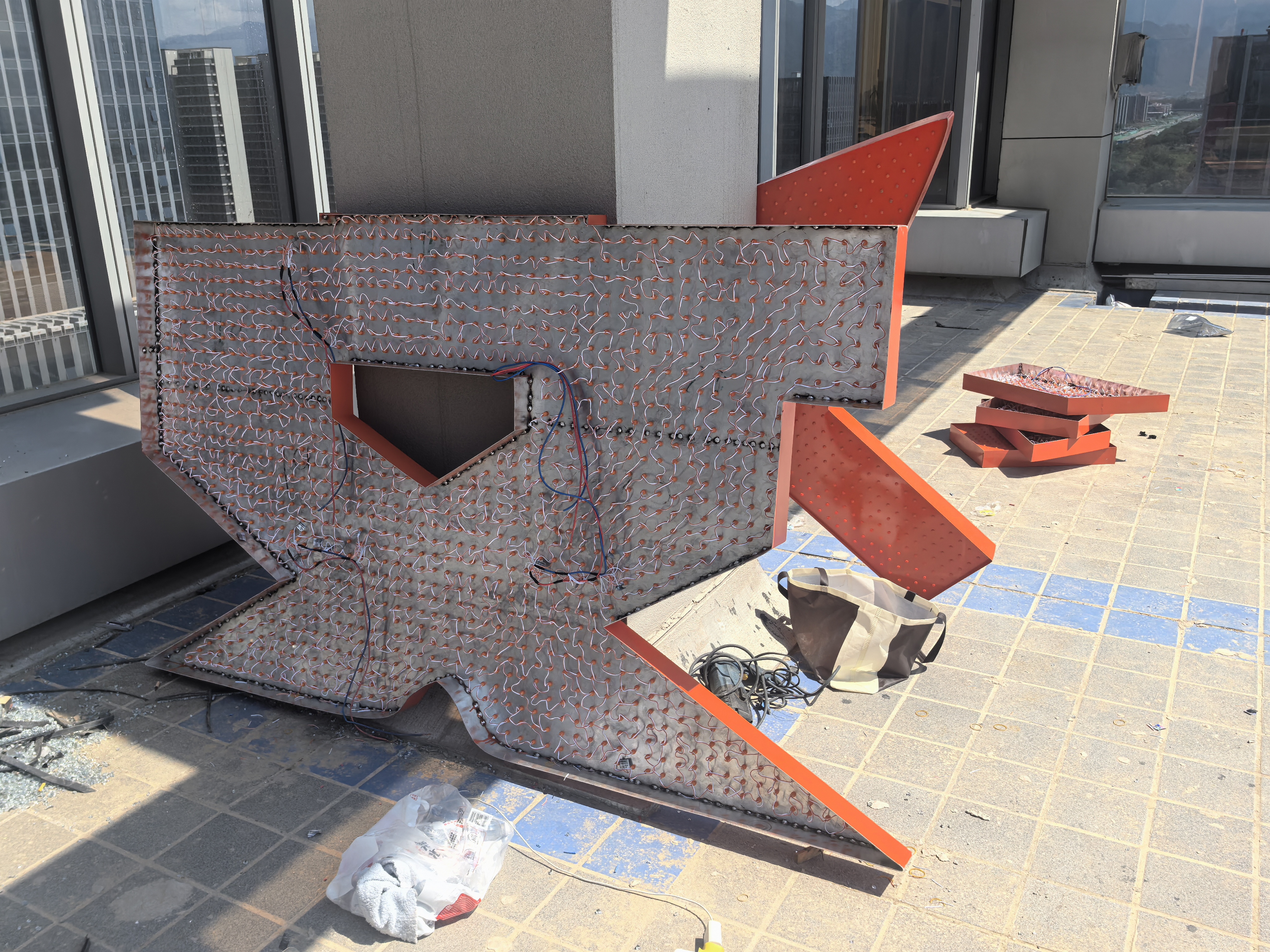設(shè)計(jì)效果是將理想狀態(tài)兌現(xiàn)于圖紙上,高還原度、高品質(zhì)的落地安裝才是項(xiàng)目的最終目標(biāo)。作為有著豐富高空作業(yè)經(jīng)驗(yàn)的施工團(tuán)隊(duì),高層樓體字的安裝早已輕車熟路,安裝師傅將提前制作完成的字體部件運(yùn)至樓頂并嚴(yán)格按照設(shè)計(jì)比例進(jìn)行組裝,從而順利完成安裝工作,1:1還原設(shè)計(jì)效果!