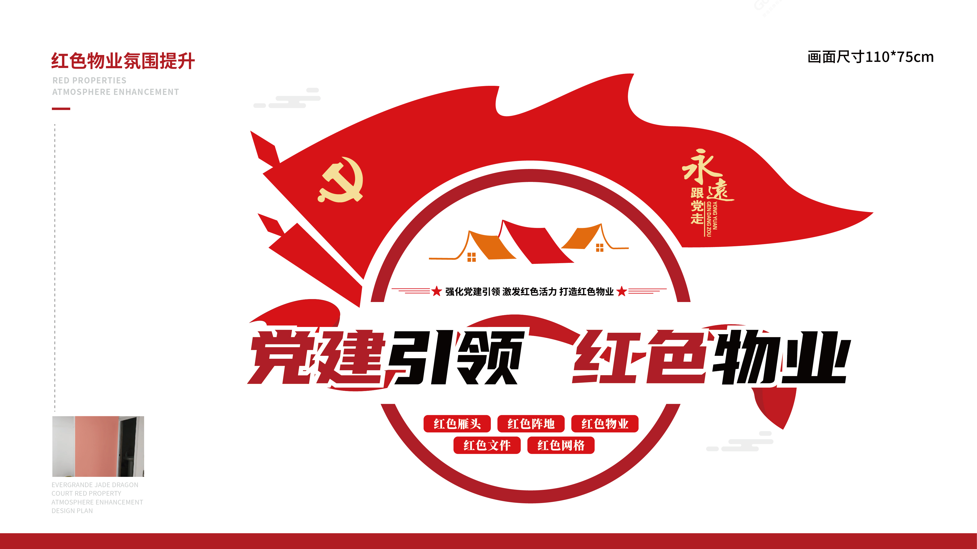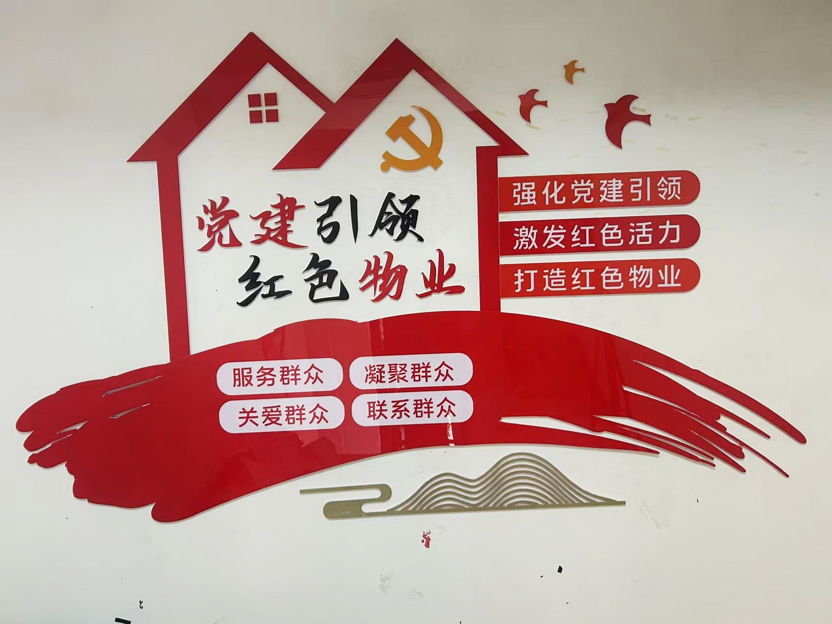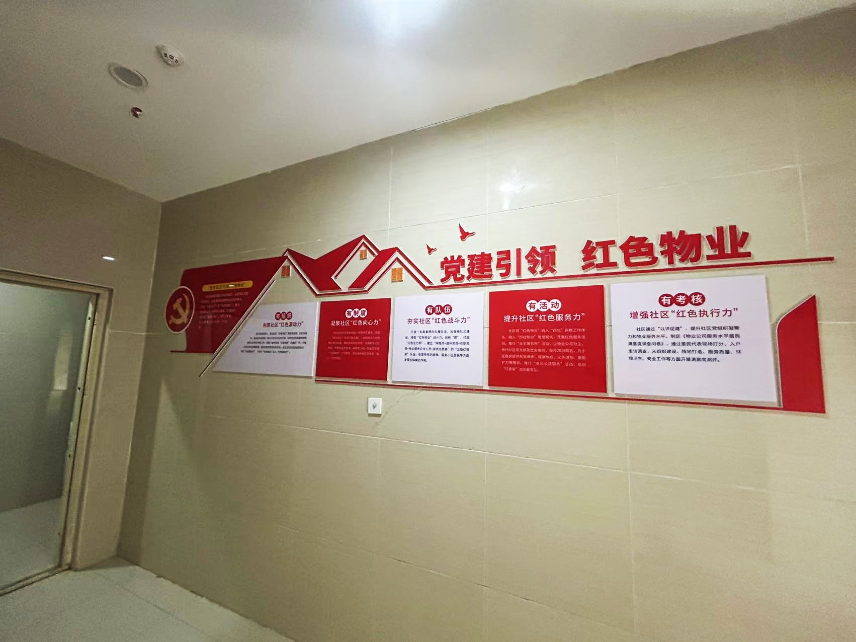 紅色物業(yè)建設,作為黨建文化的重要展示窗口,在社區(qū)工作及群眾精神凝聚上起著重要的作用。項目組因地制宜,實地走訪社區(qū)環(huán)境,擇選適宜建設與營造的最佳點位,根據(jù)設計圖紙進行1:1還原上墻,通過完整的系列氛圍搭建,將“紅色物業(yè)”建設的理念兌現(xiàn)于社區(qū)真實空間環(huán)境。