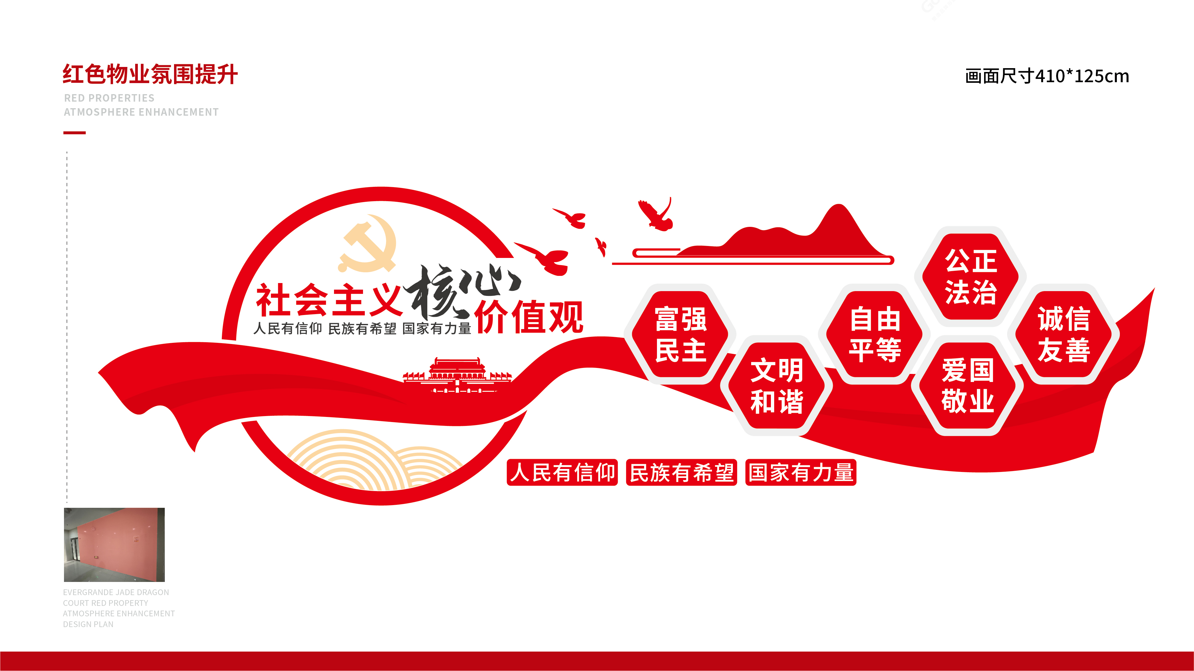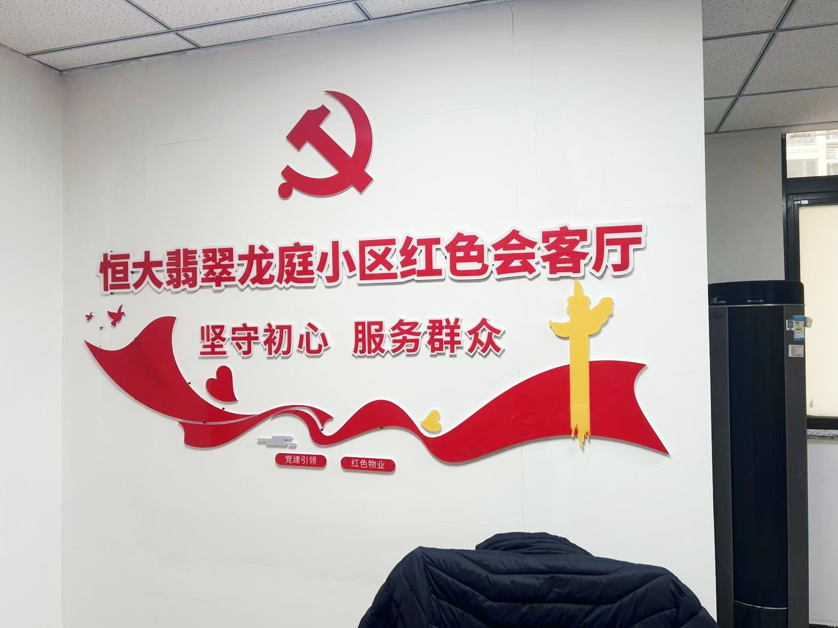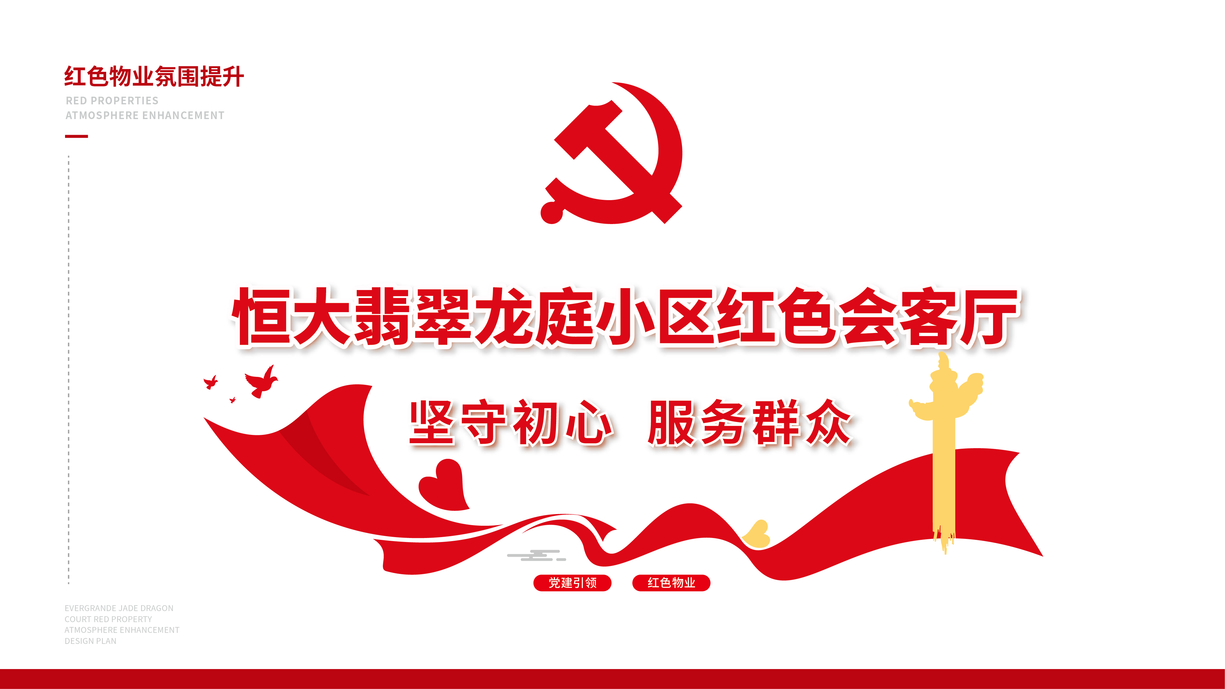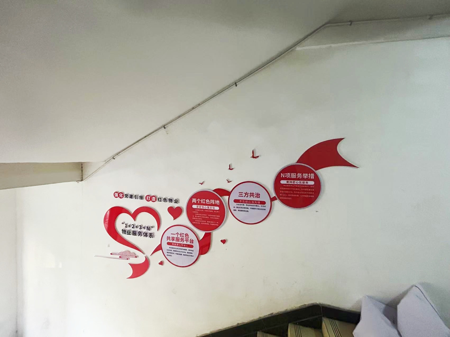 紅色物業(yè)建設,作為黨建文化的重要展示窗口,在社區(qū)工作及群眾精神凝聚上起著重要的作用。項目組因地制宜,實地走訪社區(qū)環(huán)境,擇選適宜建設與營造的最佳點位,根據(jù)設計圖紙進行1:1還原上墻,通過完整的系列氛圍搭建,將“紅色物業(yè)”建設的理念兌現(xiàn)于社區(qū)真實空間環(huán)境。